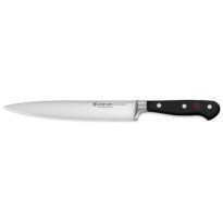 Grote stukken vlees zoals ham, rosbief en kipfilet snijd je in dunne plakken. Gebruik de hele lengte van het lange, smalle lemmet en snij in één keer door. Het lemmet is wat dunner en smaller dan een koksmes om nauwkeuriger te kunnen snijden