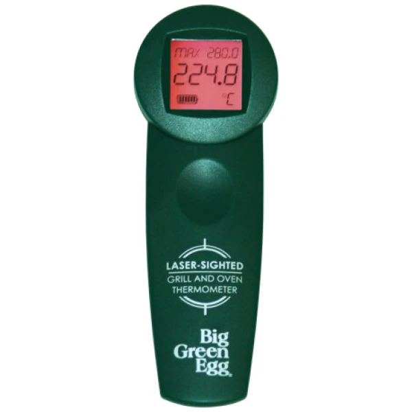 Big Green Egg Infrarood-Thermometer: Lasergamen tijdens het EGG’en? De Infrared Cooking Surface Thermometer bevat een precisielaser die nauwkeurig de temperatuur van het kookoppervlak meet. Richt hem bijvoorbeeld op de Baking Stone, Cast Iron Grid of Perforated Grid om de temperatuur te controleren voordat je er ingrediënten op legt. Deze draadloze infrarood thermometer heeft een temperatuurbereik van 0°C tot 427°C.