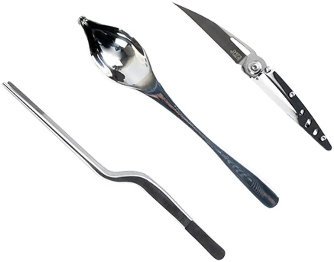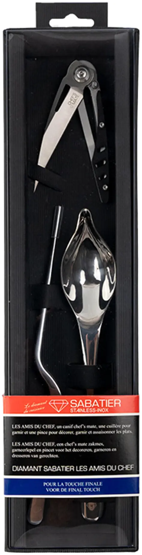 Diamant Sabatier Final Touch: Een gerecht ècht af maken gaat om het decoreren, garneren en dresseren. Daar zijn deze tools perfect voor, met de saus lepel kun je de hoeveelheid saus goed doseren en mooi over de borden heen druppelen. Met het pincet breng je de laatste finishing touch aan, bijvoorbeeld een krokantje of een paar kiem groente. Deze kun je door de ribbels aan het einde goed beetpakken. Het mesje, wat ook nog perfect in een koksbuis past, is handige voor kleine taakjes zoals: dozen op snijden, verse kruiden afsnijden en verpakkingen openen.