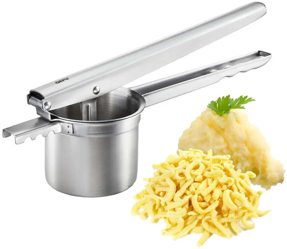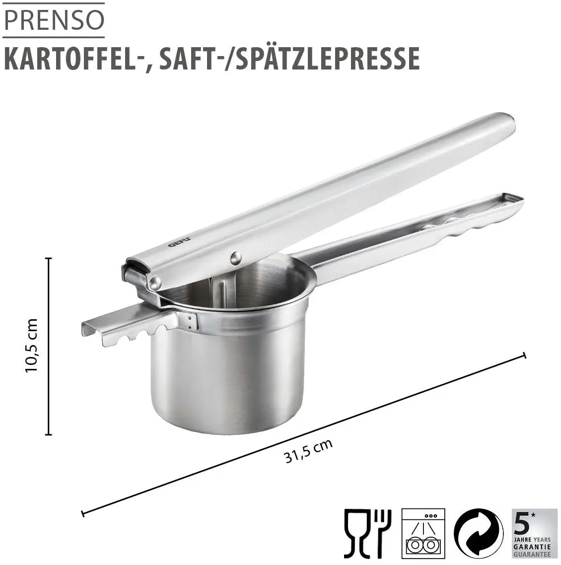 Gefu Pers Prenso: Robuuste roestvrijstalen uitvoering met drie verwisselbare geperforeerde schijven. Voor het pureren van aardappelen, groente en fruit en voor het maken van spaghetti-ijs en spaetzle.