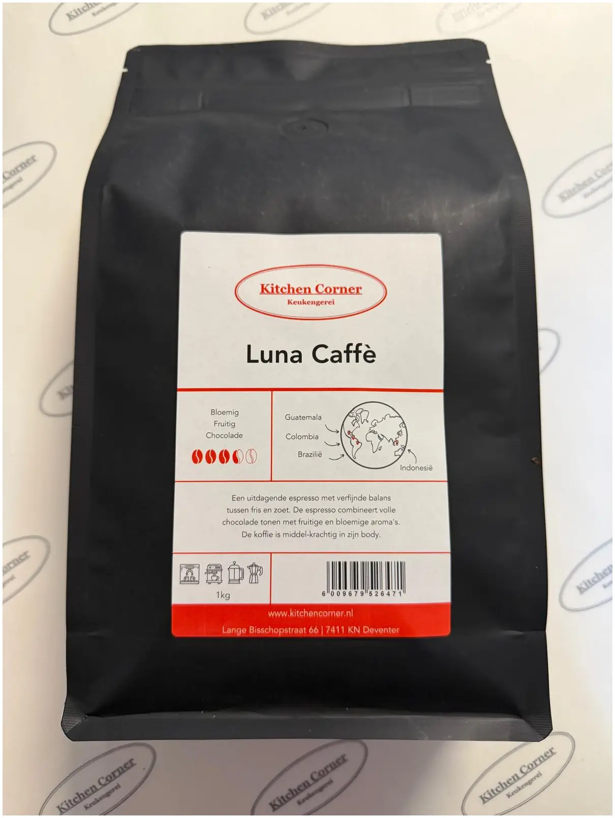 Kitchen Corner Luna Caffè-1kg: Een uitdagende espresso met verfijnde balans tussen fris en zoet. De espresso combineert volle chocolade tonen met fruitige en bloemige aroma’s. De koffie is middel-krachtig in zijn body.