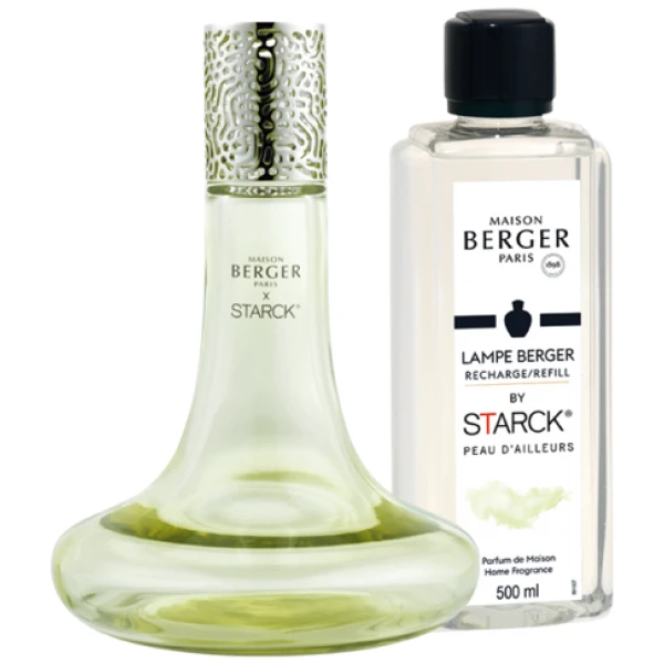 De Lampe Berger Giftset by Starck Vert, met zijn verfrissende kleur, wordt geassocieerd met het parfum Peau d’Ailleurs van 500 ml, dat een huisparfum is geworden. Deze gemengde geurcompositie, met haar ietwat excentrieke denkbeeldige aura, neemt u mee op een reis naar kosmische grootsheid. De poederachtige bloemengeuren van iris vermengen zich met authentieke minerale noten en groene, lenteachtige akkoorden, geperfectioneerd met een houtachtige en muskusachtige basis.
