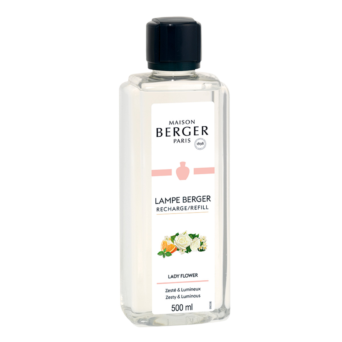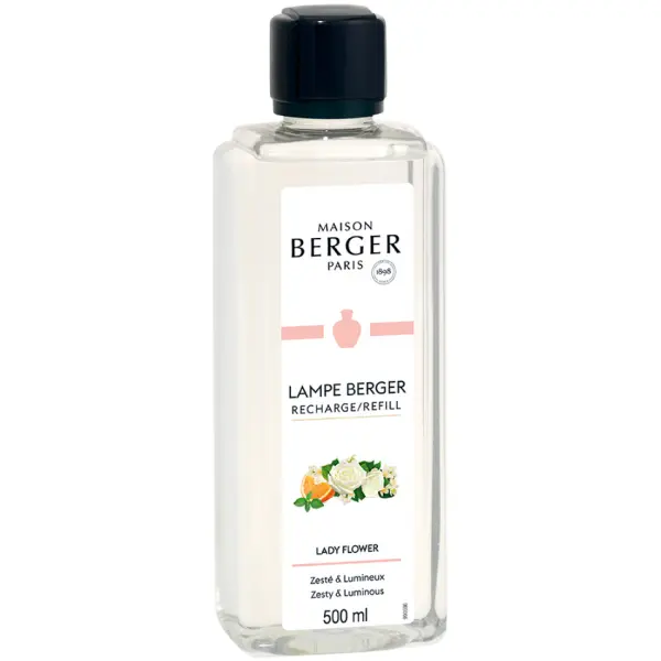 Lampe Berger Huisparfum Lady-Flower-500ml: Transformeer uw interieur met de 500ml Berger Lady Flower Lamp Refill, een bloemengeur met tonen van jasmijn, mimosa en roos.