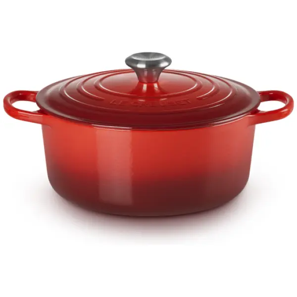 De kersenrood Signature braadpan van Le Creuset heeft een diameter van 26 cm. De ronde pan van geëmailleerd gietijzer heeft een inhoud van 5,3 liter, bedoeld voor 6 personen. De braad-/ stoofpan heeft extra grote grepen.