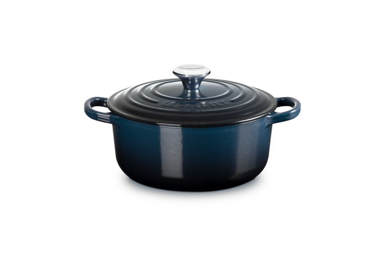 De Nuit Signature braadpan van Le Creuset heeft een diameter van 20 cm. De ronde pan van geëmailleerd gietijzer heeft een inhoud van 2,4 liter, bedoeld voor 2-3 personen. De braad-/ stoofpan heeft extra grote grepen.