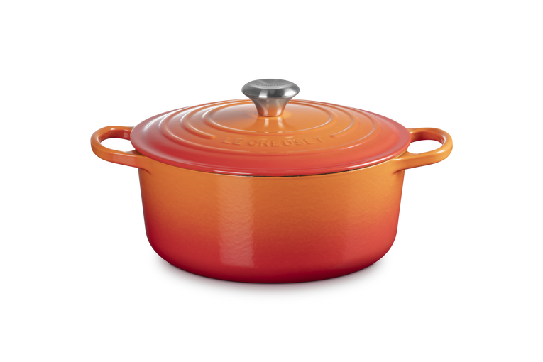De Oranjerode Signature braadpan van Le Creuset heeft een diameter van 26 cm. De ronde pan van geëmailleerd gietijzer heeft een inhoud van 5,3 liter, bedoeld voor 6 personen. De braad-/ stoofpan heeft extra grote grepen.