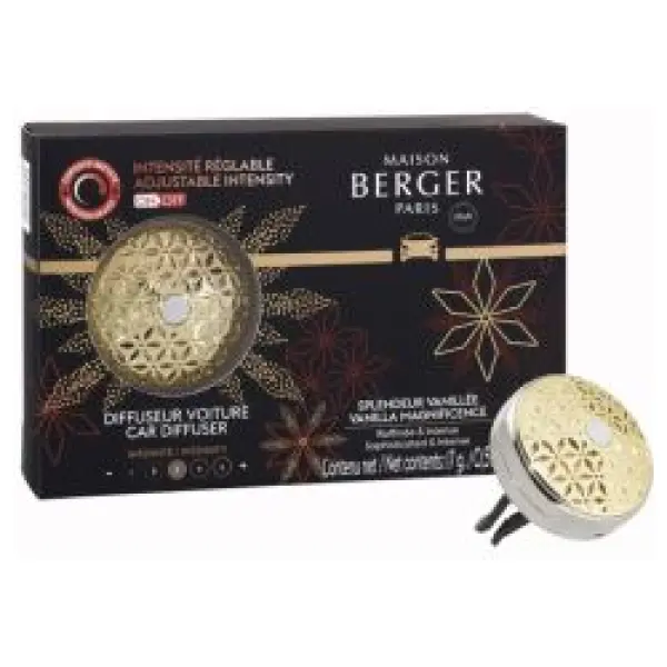 Maison Berger Autoparfum Giftset Pomelis: De Autodiffuser ON/OFF Pomelis valt op door zijn tweekleurige design in goud en zilver, met verfijnde stervormige uitsparingen die verwijzen naar de Pomelis collectie. Geïnspireerd op de pomander brengt hij een feestelijke sfeer en past hij harmonieus in elk interieur. Huisparfum Splendeur Vanillée opent met frisse tonen van sinaasappel, mandarijn en kardemom. In het hart vindt u zwarte peper, een rumakkoord en cacaoboon voor een warme, omhullende sensatie. De basisnoten van bourbonvanille, sandelhout en patchoeli zorgen voor een verfijnd, gourmand parfum. Dankzij de gepatenteerde techniek past u eenvoudig de parfumintensiteit aan. Navulbaar en subtiel, combineert hij elegantie met puur parfumgenot.