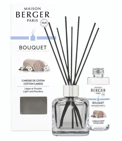 Maison Berger Geurstokjes Giftset Caresse-de-Coton: De parfumverspreider Cube met het huisparfum Caresse de Coton voorziet uw interieur op subtiele en op continue wijze van een aangenaam fris parfum dat doet denken aan pas gewassen wasgoed.