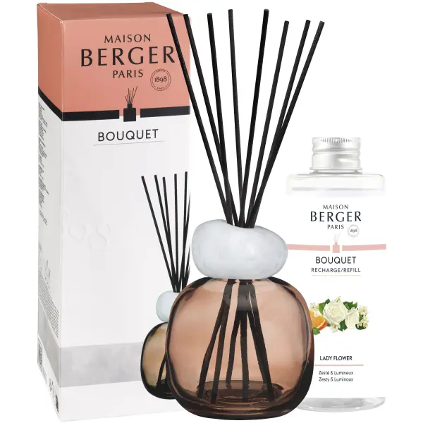 Maison Berger Geurstokjes Giftset Mineral-Prune: Combineer modern design en delicate geuren met het Mineral Plum Scented Bouquet en de Lady Flower-geur met betoverende bloemenaccenten.