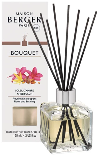 Maison Berger Geurstokjes Giftset-Soleil d-Ambre: De Parfumverspreider Soleil d’Ambre verspreidt zijn fleurige en omhullende geurnoten van tuberoos, ylang en ambre solaire als een waar vakantieparfum.
