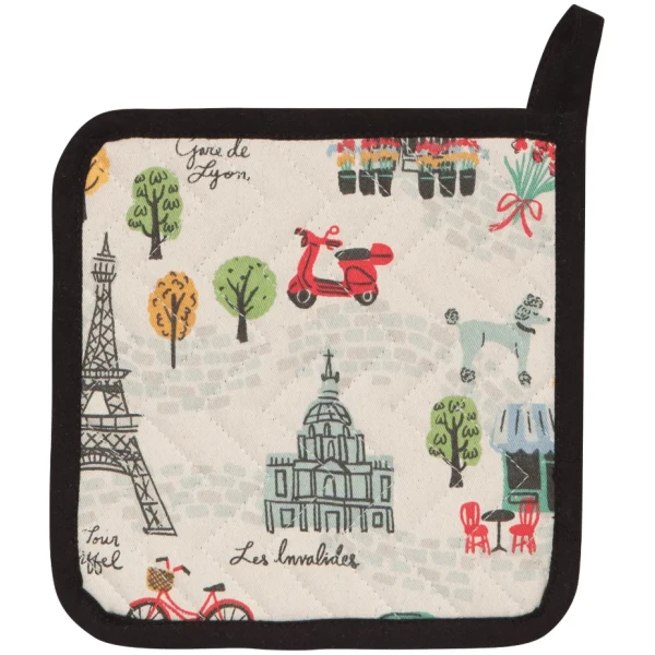 NowDesigns Pannenlap Paris: De Now Designs pannenlap is aan de buitenkant gemaakt van 100% katoen en aan de binnenkant van polyester, de lap is voorzien van een meet me in Paris design. De pannenlap gebruikt u voor uw handen ter bescherming van hitte van pannen of ovenschalen. De pannenlap is 20 x 20 cm.