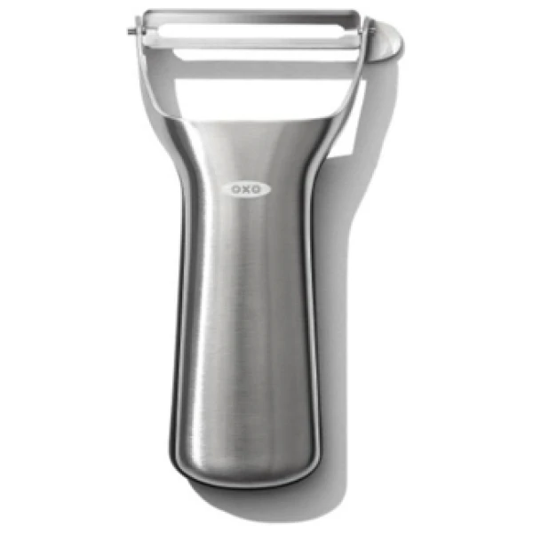 Oxo Dunschiller Y-model Steel: Deze elegante dunschiller ‘SteeL’ van OXO Good Grips is perfect voor het schillen van aardappels, komkommers, appels, wortels en meer! Zelfs de hardste fruit- en groentesoorten schil je met gemak en de dunschiller verwijdert alleen de schil, niet het fruit eronder.