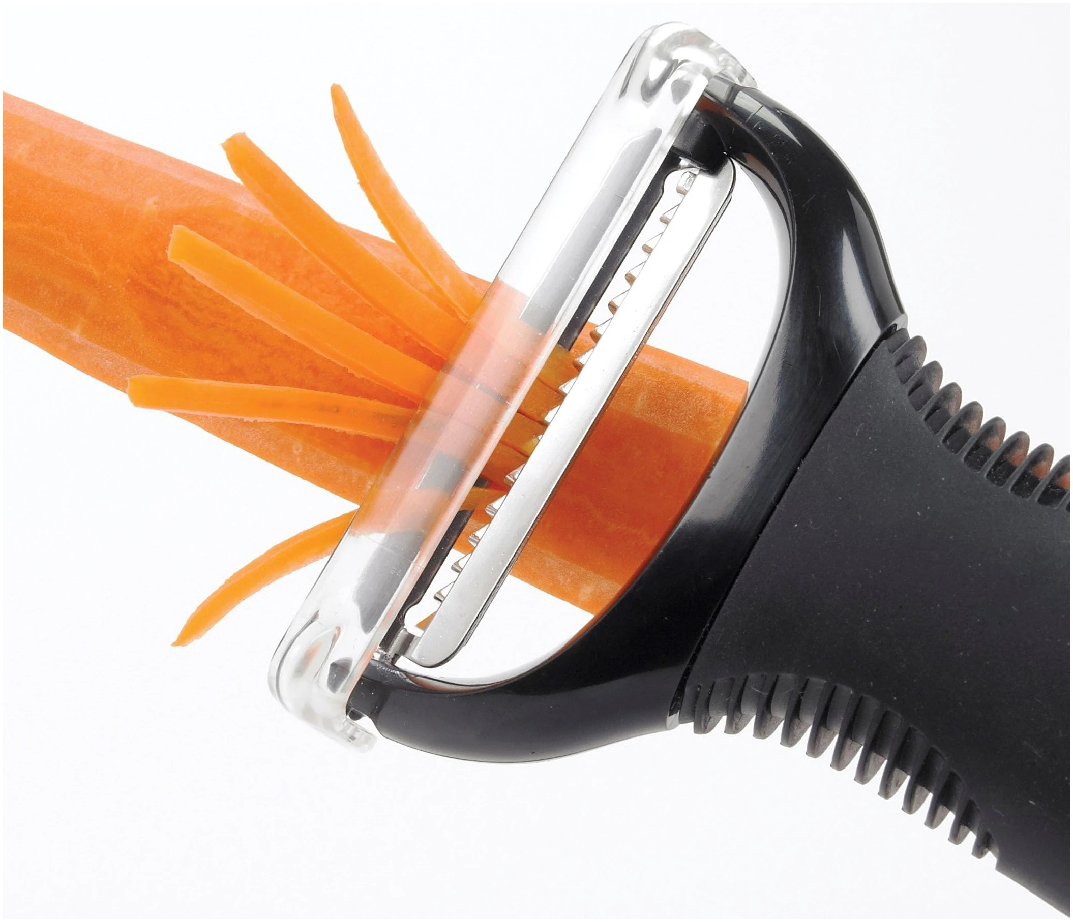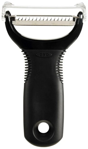 Oxo Juliënne Snijder Y-model: Met deze Julienne snijder van OXO Good Grips snijd je perfecte Julienne strips uit stevige fruit en groenten als courgettes, wortelen, aardappelen, appels of citrusvruchten. Julienne strips zijn lekker in salades, Aziatische gerechten, ter garnering en meer. De Julienne snijder heeft een scherp roestvrijstalen snijblad en is voorzien van een transparant beschermkapje voor veilig opbergen. De zachte, comfortabele greep steunt je hand tijdens het gebruik en is antislip, zelfs wanneer je handen nat zijn. De greep is bovendien voorzien van een ophangoog. De dunschiller is ook te gebruiken als je linkshandig bent. Na gebruik mag de Julienne snijder in de vaatwasmachine.