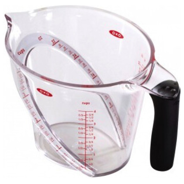 Oxo Maatkan 1 liter: Deze maatkan van OXO Good Grips heeft een slimme maatverdeling op de schuine rand in de kan. Hierdoor lees je de inhoud eenvoudig af door van bovenaf in de kan te kijken. Slim -want vullen, bukken, checken en weer bijsturen behoort hiermee tot het verleden! De maatkan heeft een inhoud van 1 liter, meet per 100 ml en de maatverdeling is duidelijk leesbaar. De maatkan is voorzien van een schenktuit en is geschikt voor de magnetron. De zachte comfortabele greep biedt een stevige greep, ook wanneer je handen nat zijn. Na gebruik mag de maatkan, die uiteraard bpa-vrij is, in de vaatwasmachine.