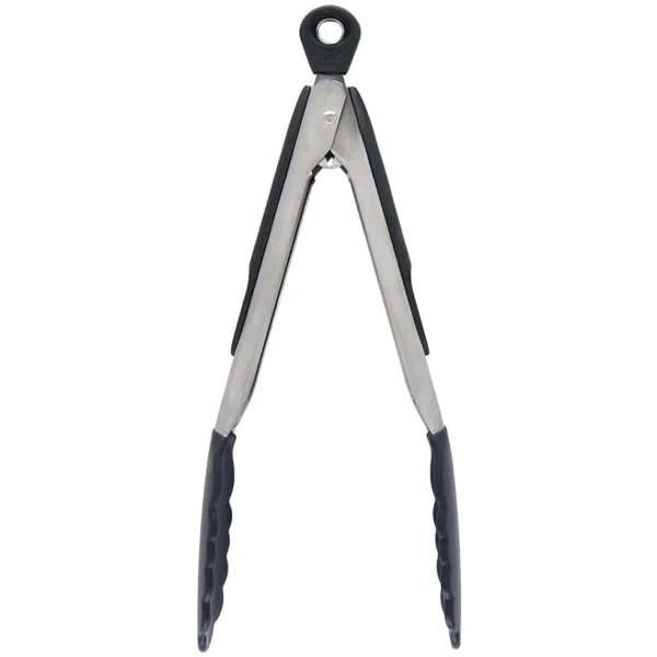 OXO Serveertang Siliconen-30cm : Deze serveertang van OXO Good Grips is perfect voor het keren en serveren van vlees, groenten en meer. Dankzij de hittebestendige siliconen koppen is de serveertang veilig voor gebruik in pannen met een anti-kleef laag. De serveertang ligt prettig in de hand dankzij de zachte anti-slip grepen. Na gebruik klik je de tang eenvoudig dicht voor compact opbergen, het slot is bovendien voorzien van een uitschuiftab die je als ophangoog kunt gebruiken. De serveertang is 30 cm lang, gemaakt van geborsteld roestvrijstaal en mag na gebruik in de vaatwasmachine.
