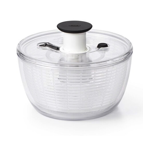 OXO Slacentrifuge mini: Het bereiden van salades gaat snel en ook gemakkelijk. Pomp eenvoudigweg de grote zachte, anti-slip knop om de centrifuge te laten draaien. Het pompen gaat licht en makkelijk, zelfs met één hand. Dankzij de anti-slip ring op de onderzijde blijft de slacentrifuge stevig op zijn plaats. Met de ingebouwde rem stopt de centrifuge direct; en na gebruik klikt de grote knop naar beneden voor compact opbergen. De mooie heldere schaal kan ook als serveerschaal worden gebruikt, en ook de mand kan prima los worden gebruikt. Voor grondig schoonmaken kun je de deksel uit elkaar halen. De slacentrifuge is gemaakt van bpa-vrij kunststof.