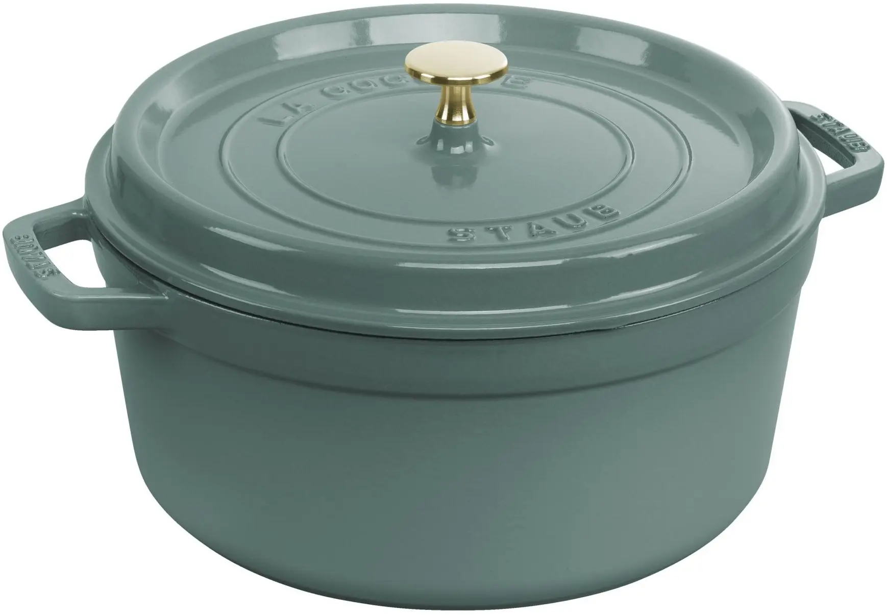 Staub Braadpan Eucalyptus 26cm: Het mat zwart afgewerkte emaille aan de binnenzijde vereenvoudigt bovendien het onderhoud van uw cocotte. Het platte deksel is ook uitgerust met picots zodat uw gerecht continu en ook gelijkmatig wordt bevochtigd, voor een nog sappiger resultaat. Omdat het de warmte uitstekend vasthoudt, is koken met gietijzer tevens ook zeer energiebesparend.