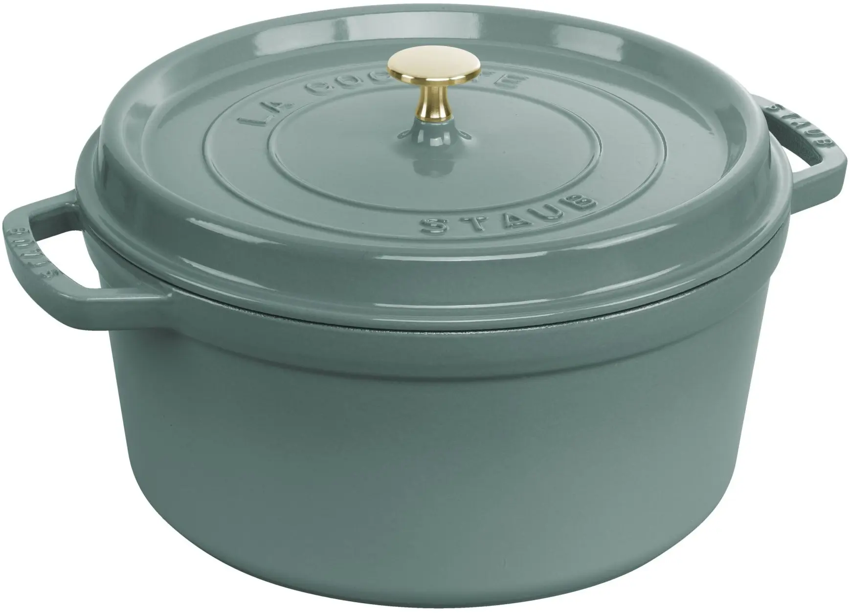 Staub Braadpan Eucalyptus 28cm : Het mat zwart afgewerkte emaille aan de binnenzijde vereenvoudigt bovendien het onderhoud van uw cocotte. Het platte deksel is ook uitgerust met picots zodat uw gerecht continu en ook gelijkmatig wordt bevochtigd, voor een nog sappiger resultaat. Omdat het de warmte uitstekend vasthoudt, is koken met gietijzer tevens ook zeer energiebesparend.