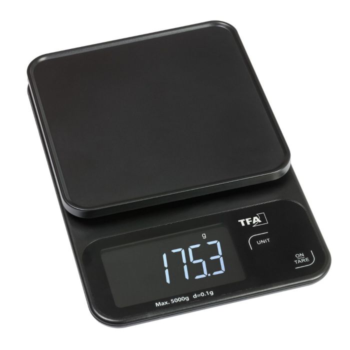 TFA Keukenweegschaal Cookie:Ontdek de TFA keukenweegschaal Cookie in stijlvol zwart die modern minimalisme combineert met praktische precisie. Dankzij het ultradunne ontwerp schuift deze weegschaal moeiteloos in je keukenlade; het LED-display blijft zelfs in weinig licht perfect leesbaar. Met een meetbereik van 1 g tot 5 kg en een resolutie van 0,1 g weeg je kruiden en specerijen met uiterste nauwkeurigheid; schakel eenvoudig tussen gram, milliliter, oz of fl oz. De tara-functie maakt stapgewijze weging in één kom mogelijk; de verhoogde rand voorkomt wegrollen van kleine ingrediënten zoals tomaten of bessen. Anti-sliprubbertjes zorgen voor stabiliteit; de automatische uitschakeling spaart energie. Bedien moeiteloos met sensorknoppen, houd alles schoon dankzij het gladde oppervlak; hang hem op via de ophangoog of bewaar hem plat in de lade.