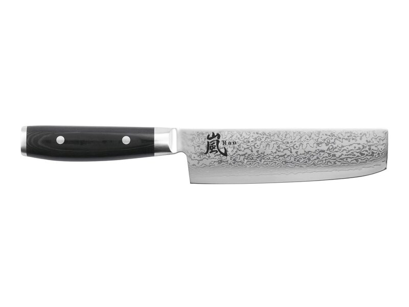 Yaxell Ran Nakiri 16.5cm : Nakiri koksmes uit de Japanse Ran serie. Het mes is 16.5cm en heeft een 69 lagen damast lemmet met een zwart canvas-micarta handvat.