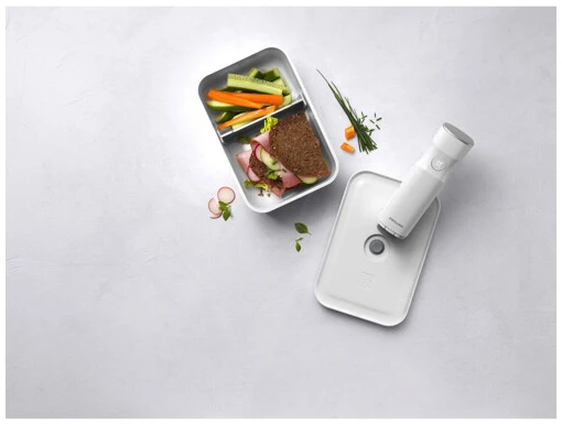 De slimme vacuümpomp vertraagt ook de oxidatie, zodat salades knapperig en tevens groen blijven, waarbij de vitamines en ook de smaken worden opgesloten. De handige compartiment verdeler die bij de lunchbox wordt geleverd, zorgt er ook voor dat etenswaren gescheiden blijven. Hierdoor blijven ze uren en dagen na het inpakken in topvorm.